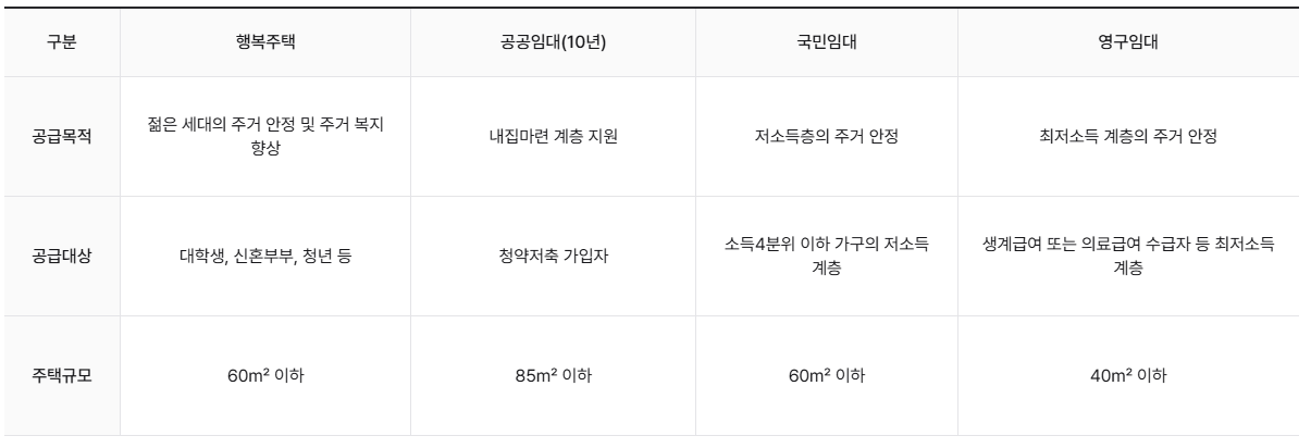 행복주택은 일반 임대주택과 달리 청년, 신혼부부, 고령자 등 특정 계층을 대상으로 하며 시세보다 낮은 임대료로 제공됩니다. 시세 대비 낮은 임대료와 장기간 거주가 가능한 점은 초기 주거비 부담을 줄여 주거 안정성을 높이는 장점이 있습니다.
