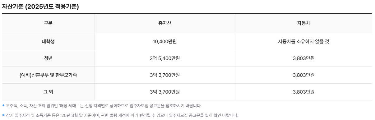 소득 기준은 가구별 도시근로자 월평균 소득의 일정 비율 이하로 제한되며 1인 가구와 2인 이상 가구 기준이 다르게 적용됩니다. 1인 가구는 월평균 소득 100% 이하, 맞벌이 신혼부부는 120%까지 허용됩니다. 자산 기준은 부동산, 금융자산, 자동차 등을 합산하여 일정 금액 이하인 경우만 입주가 가능하며 청년 1인 가구는 1억 원 이하, 청년 가구는 2억 5천만 원 이하, 신혼부부 및 한부모 가구는 3억 3천만 원 이하로 제한됩니다.