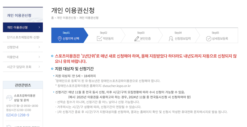이후 개인 이용권 신청 메뉴를 선택해 거주 지역을 입력하고 약관 동의, 본인 인증, 신청 정보 및 상세 정보 입력 과정을 거치면 신청이 완료됩니다. 신청 후에는 국민체육진흥공단과 담당 기관에서 심사를 진행하여 최종 대상자가 결정됩니다.
