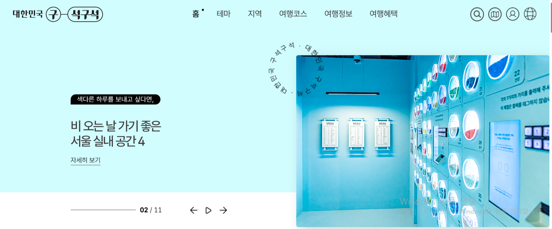 한국관광공사가 운영하는 국내 여행 정보 서비스. 대한민국 구석구석의 아름다운 국내 여행지로 즐거운 여행 다녀오세요!