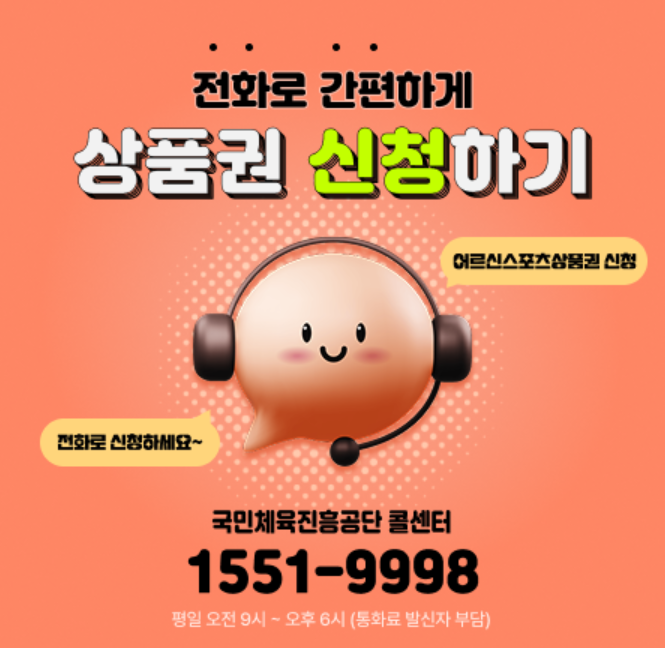 마지막, 전화 신청입니다. 국민체육진흥공단 콜센터(☎ 1551-9998)를 통해 전화로 신청하실 수 있습니다. 전화는 평일 오전 9시~ 오후 6시까지 가능합니다.
